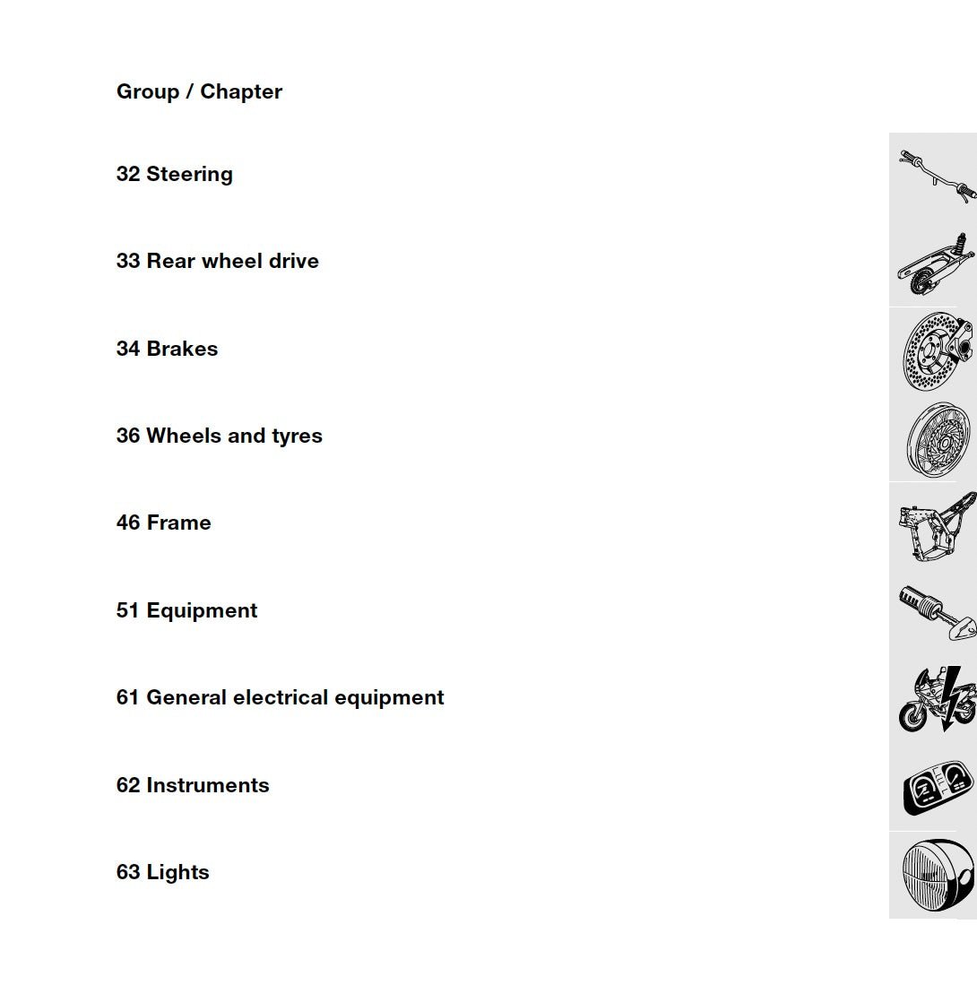 Features Chapters: Tightening Torques/Operating Fluids, Pre-Delivery Check, Maintenance, Motor/Engine Electrics, Fuel Preparation and Control, Fuel Tank and Lines, Radiator, Exhaust System, Clutch, Gearbox, Drive Chain, Front Forks/Steering, Rear Wheel Drive, Brakes, Wheels and Tyres, Frame, Equipment, General Electrical Equipment, Instruments, Lights